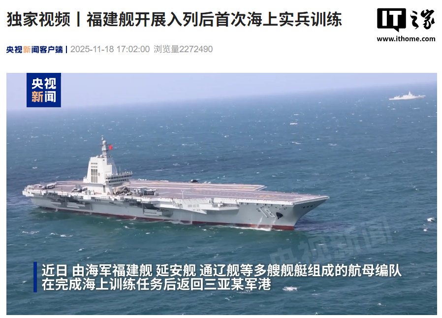 据IT之家此前报道,我国第一艘电磁弹射型航空母舰福建舰入列授旗仪式于 11 月 5 日在海南三亚某军港举行。我国三航母时代正式来临。